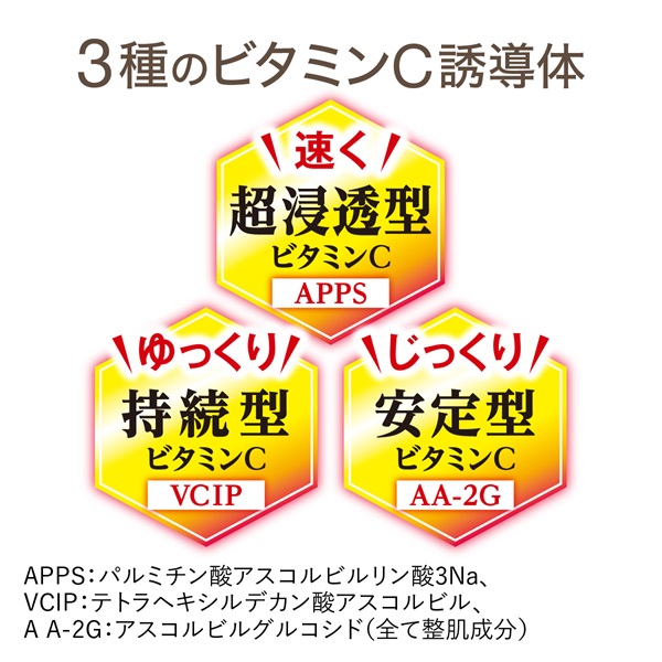 シミケアと年齢肌ケアを同時にできる『VCスペシャルジェル』には、超浸透・持続・安定と、性質が異なる「ビタミンC」を3種も配合。さまざまな角度から、悩みにアプローチすることで、より早く効果的に透明ハリ肌へ導きます!
